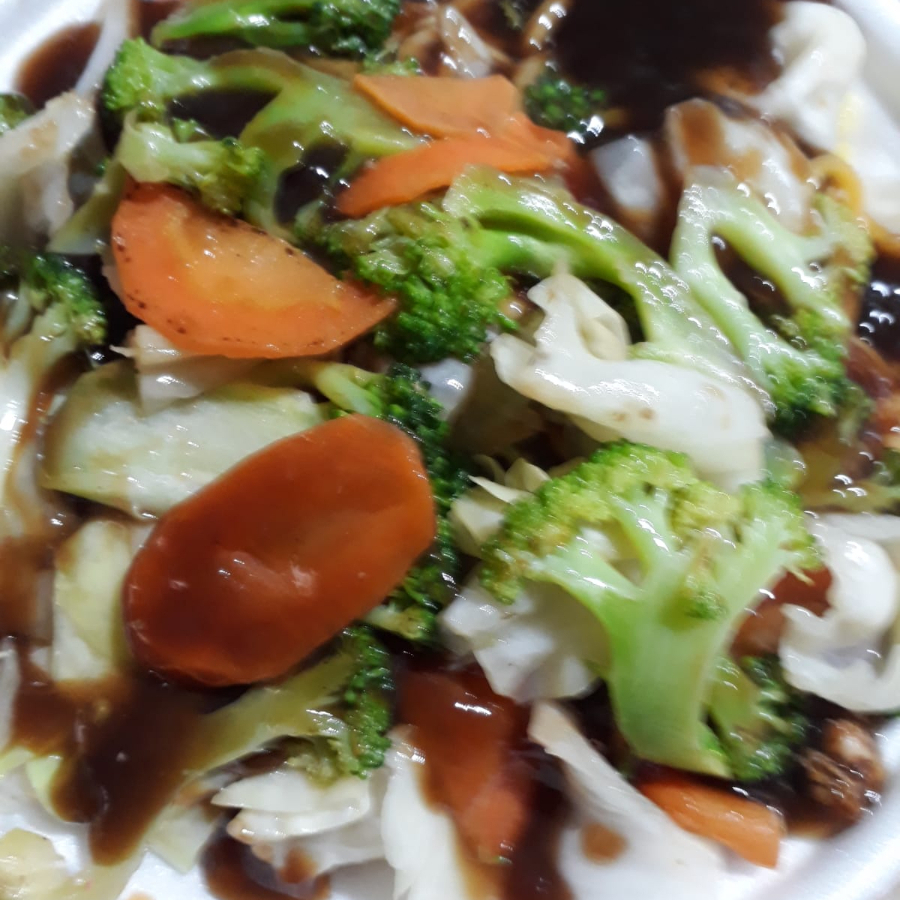 Macarrão grelhado, molho, frango, legumes e verduras.