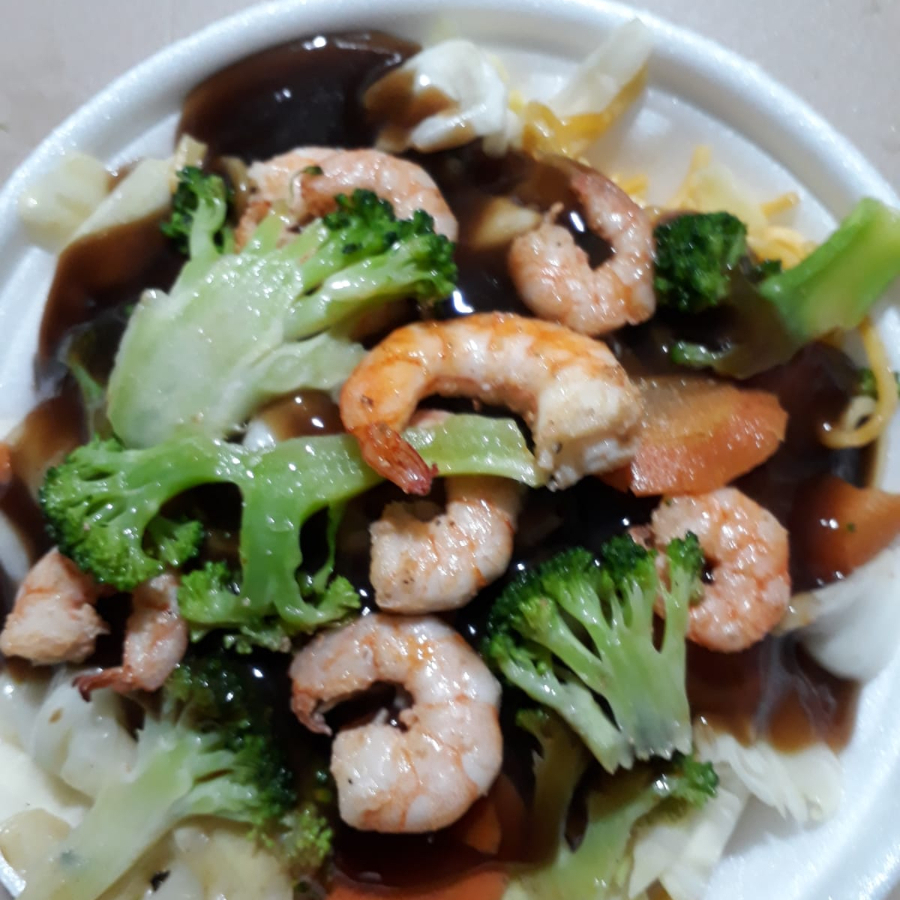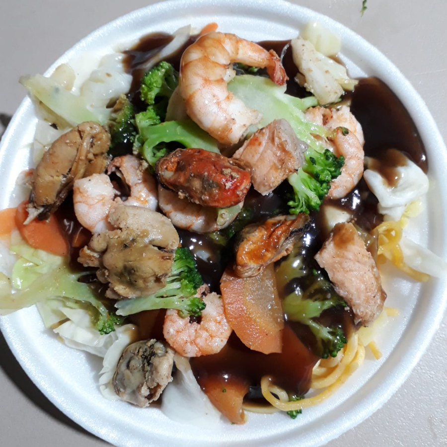 Macarrão grelhado, molho, lula, mexilhão, salmão e adicional de camarão.