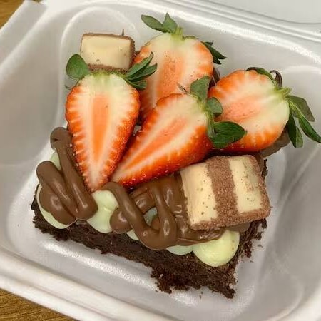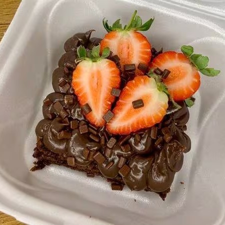 Brownies com uma generosa cobertura de creme de Ninho ou brigadeiro belga, fica a sua escolha. E um lindo enfeite de morangos frescos por cima. Se for presente nos avise, colocamos um lacinho ou um recadinho, como preferir!