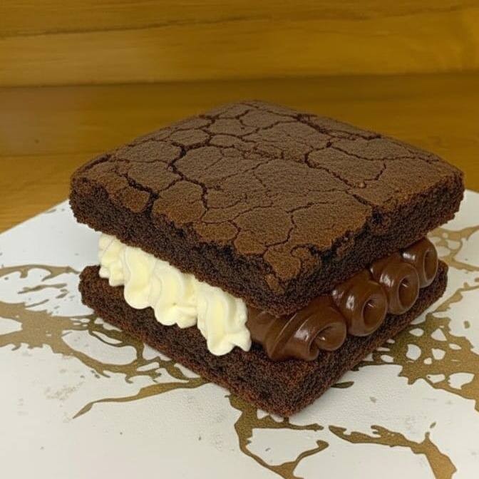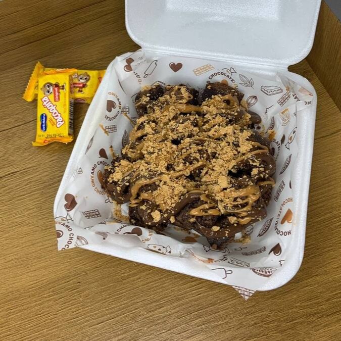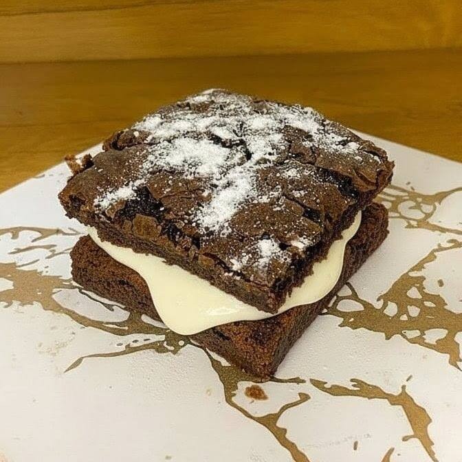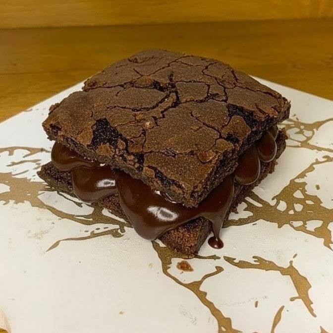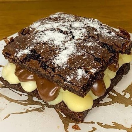 Brownie com massa artesanal a base de chocolate nobre recheado com nossos cremes de Ninho e brigadeiro belga. Absurdamente viciante.