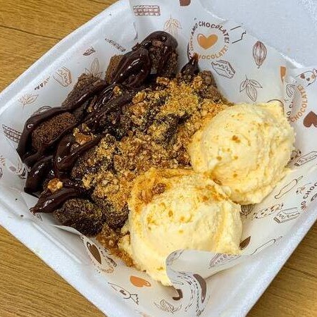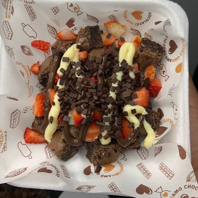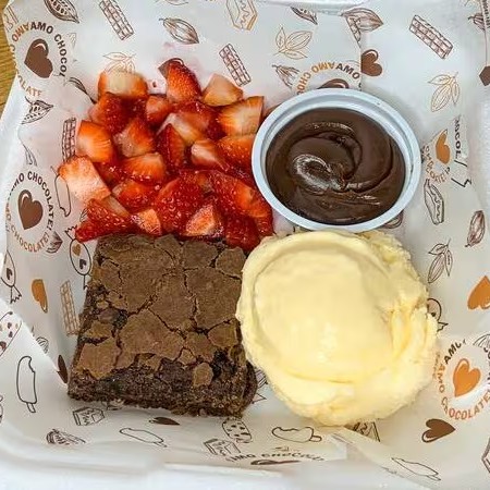Brownie caseiro 5x5, morangos fresquinhos picados, uma bola generosa de sorvete de creme e um potinho de creme especial da casa, pode ser ganache, brigadeiro, Ninho, Nutella. Você escolhe!