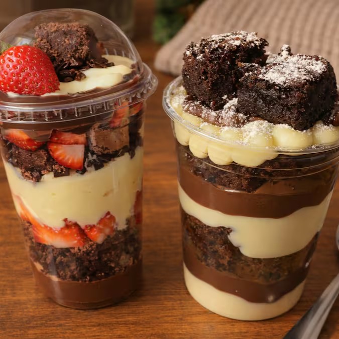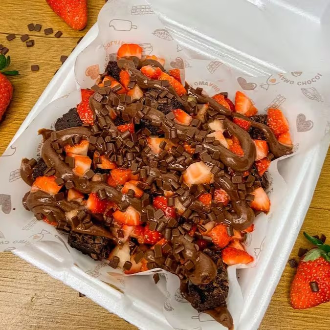 Bites do nosso delicioso brownie artesanal distribuídos em camadas, cobertos com frutas picadas fresquinhas, podendo ser morango ou uvas e finalizado com nosso delicioso brigadeiro belga, com uma camada de granule de chocolate nobre para completar essa explosão de sabor!!!