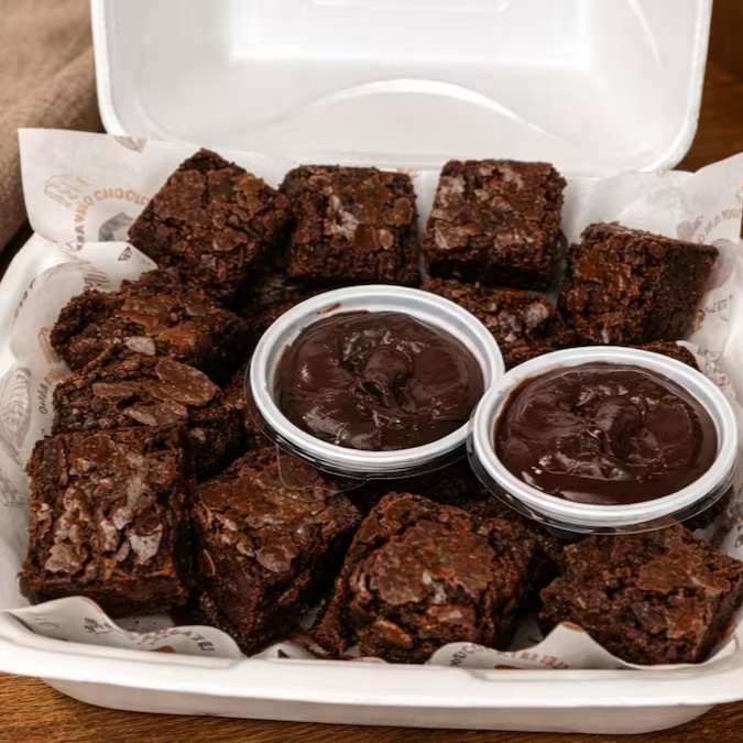 Quadradinhos do nosso brownie tradicional a base de chocolate nobre, com creme opcional de Nutella, ganache meio amarga, brigadeiro cremoso ou creme de leite Ninho.