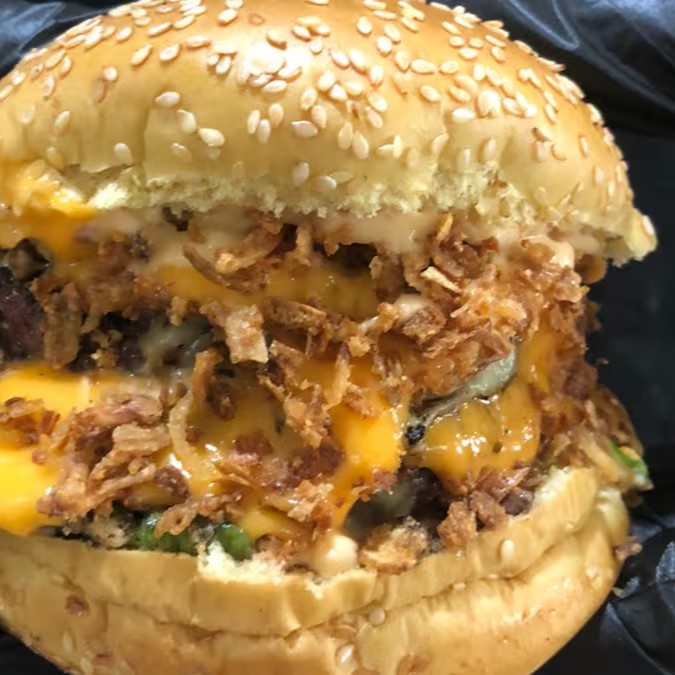 - Pão, Mayo, alface, burger, mussarela, cheddar cremoso, burger, mussarela, cheddar cremoso e Cebola Crispy.