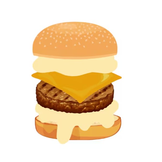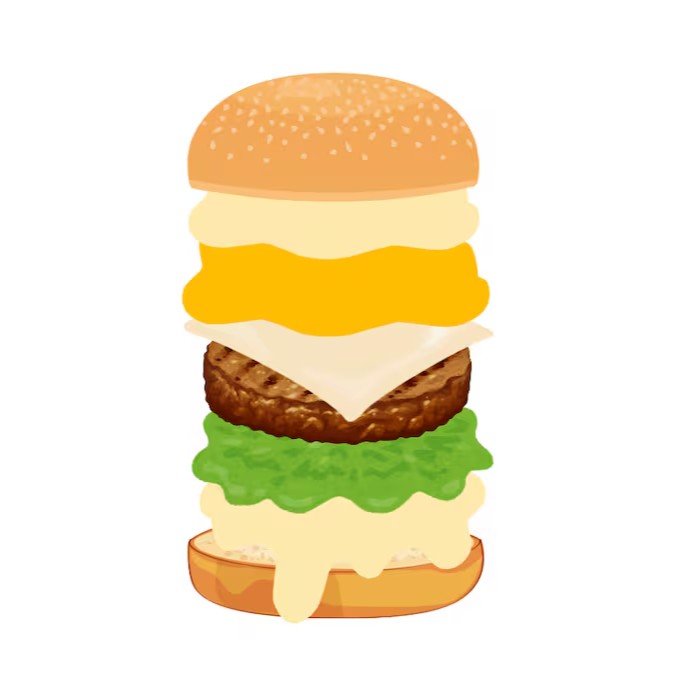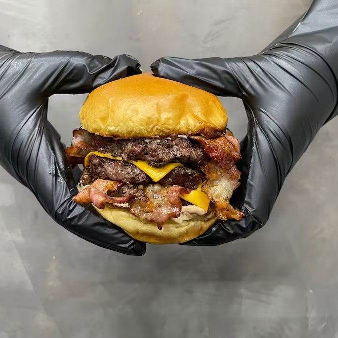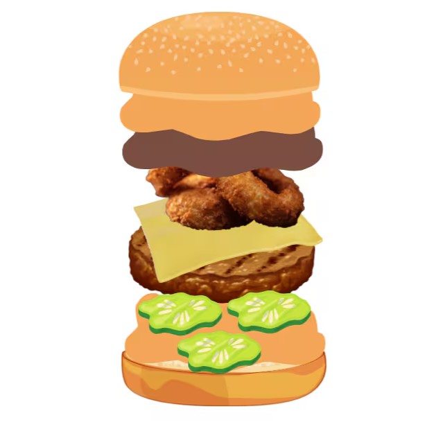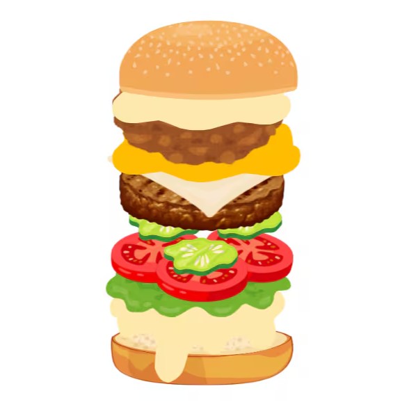 - Pão, Mayo, alface, burger, mussarela, cheddar cremoso, burger, mussarela, cheddar cremoso e bacon fatiado.