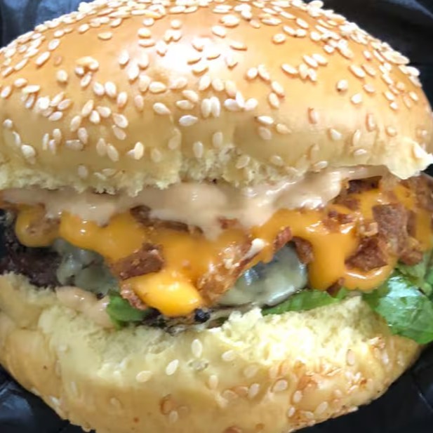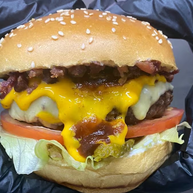 - Pão, Mayo, Alface, picles, tomate, burger 140g, mussarela, cream cheddar, bacon, molho barbecue.