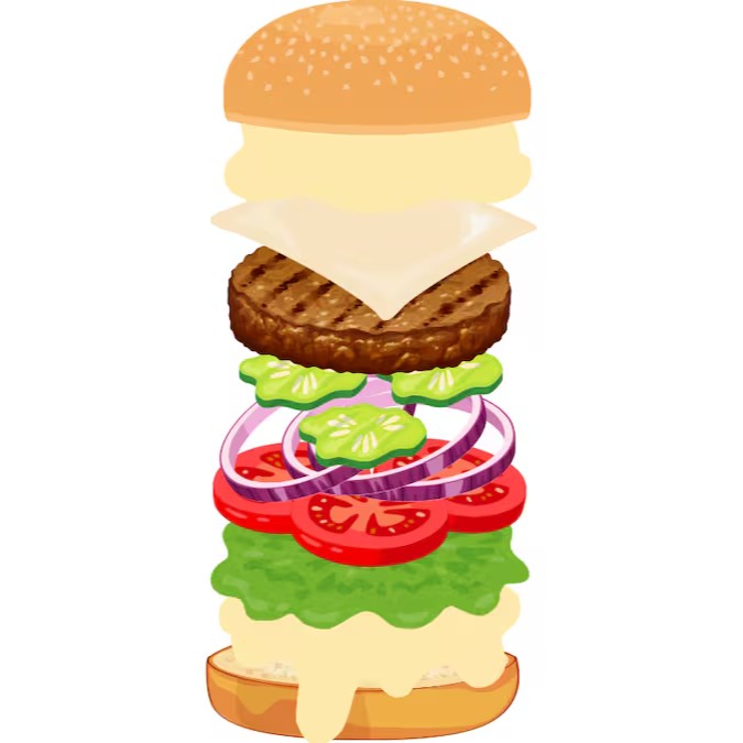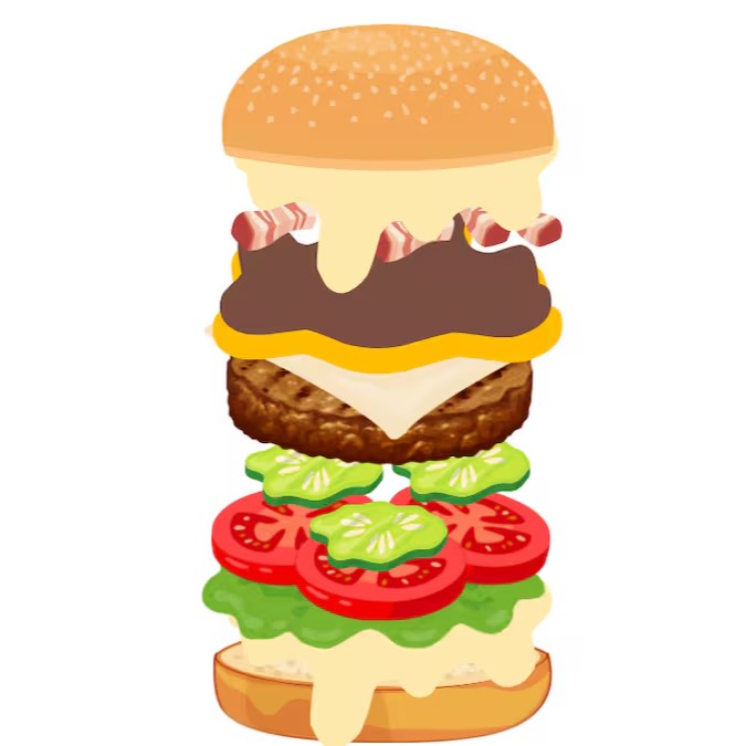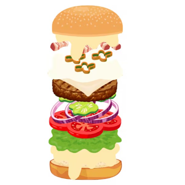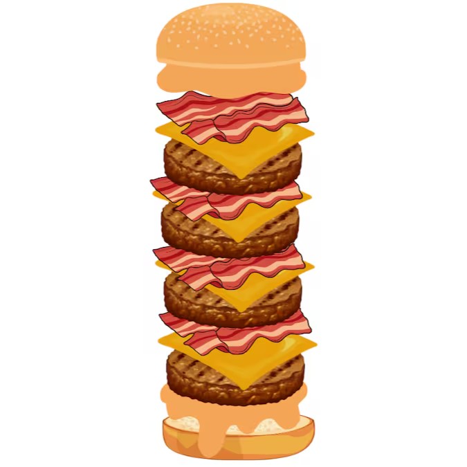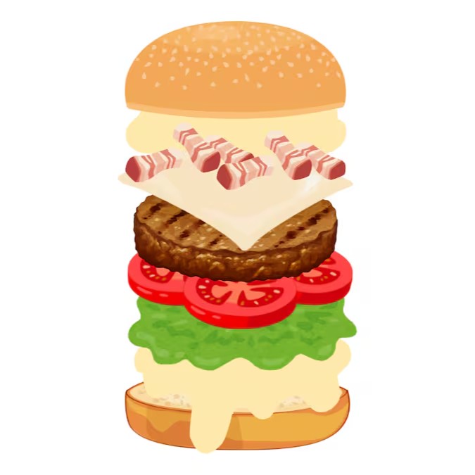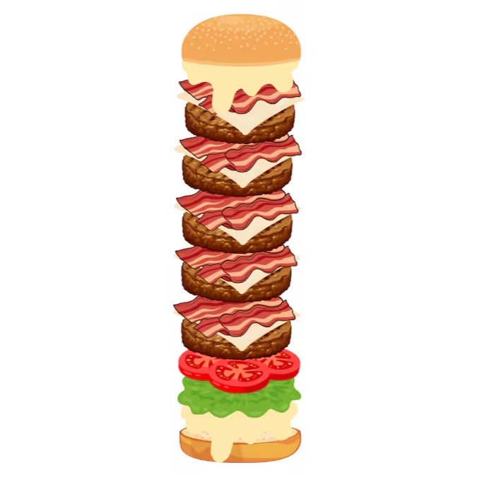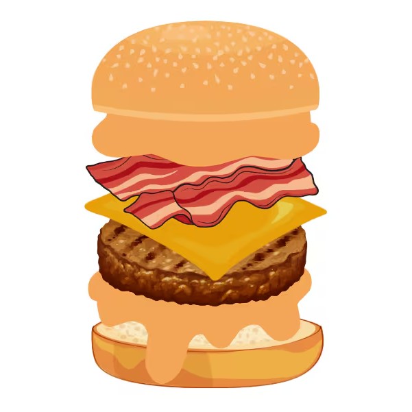 Pão, maionese, alface, tomate, 5x burger, 5x mussarela, 5x bacon fatiado.