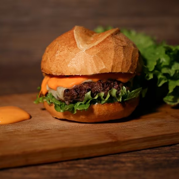 Pao, maionese, alface, burger, mussarela, cheddar cremoso.