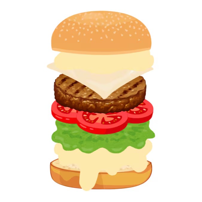 - Pão, maionese, alface, tomate, burger, mussarela