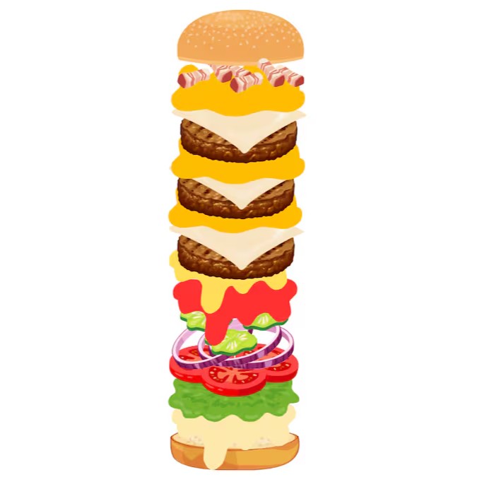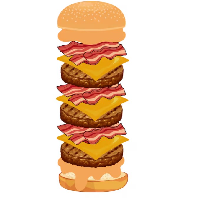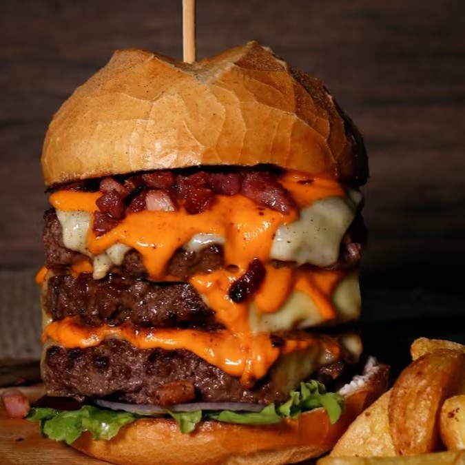 Pão, alface, tomate, picles, cebola roxa, ketchup, mostarda, 3xburger, 3x mussarela fatiada, 3x cheddar cremoso e bacon em cubos.