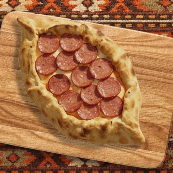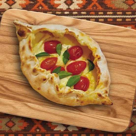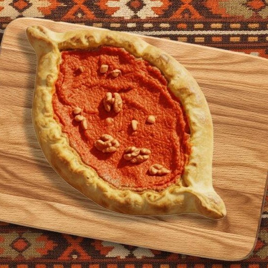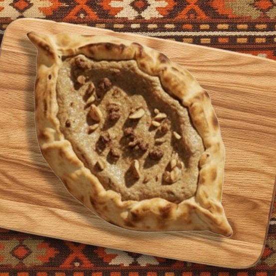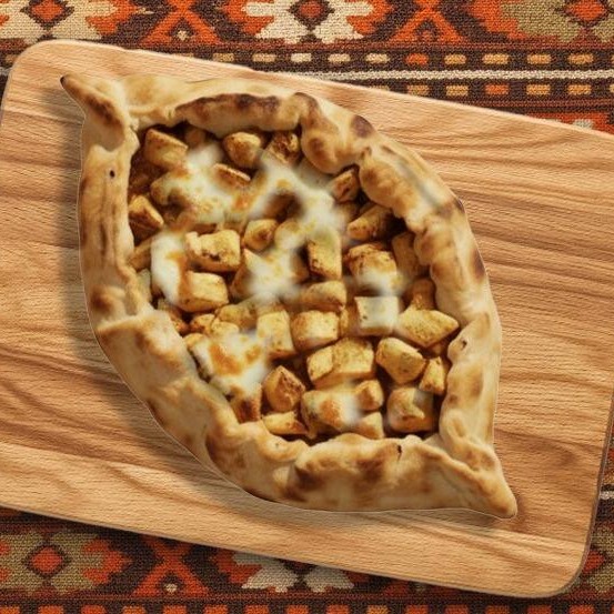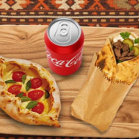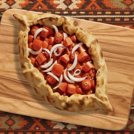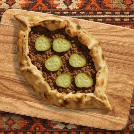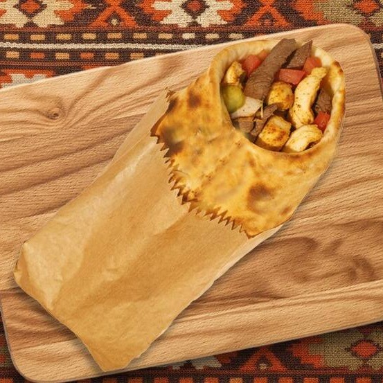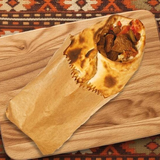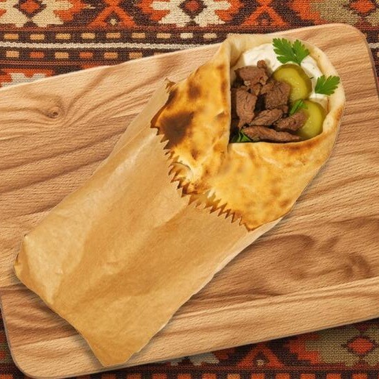 150g de carne (coxão mole) temperado - creme de alho artesanal - molho de romã - tomate - piclesfeito com massa de pizza fina, não é pão sírio, e não é pastel assado