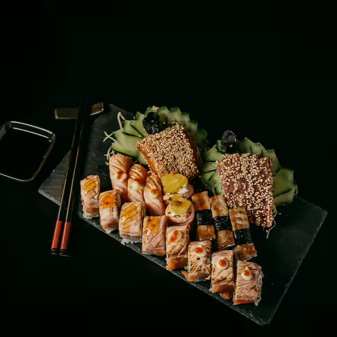 5 sashimi salmão black, 5 sashimi atum selado, 3 aburi, 3 niguiri salmão, 2 niguiri jow especial, 4 uramaki ebitem e 4 uramaki spice shake