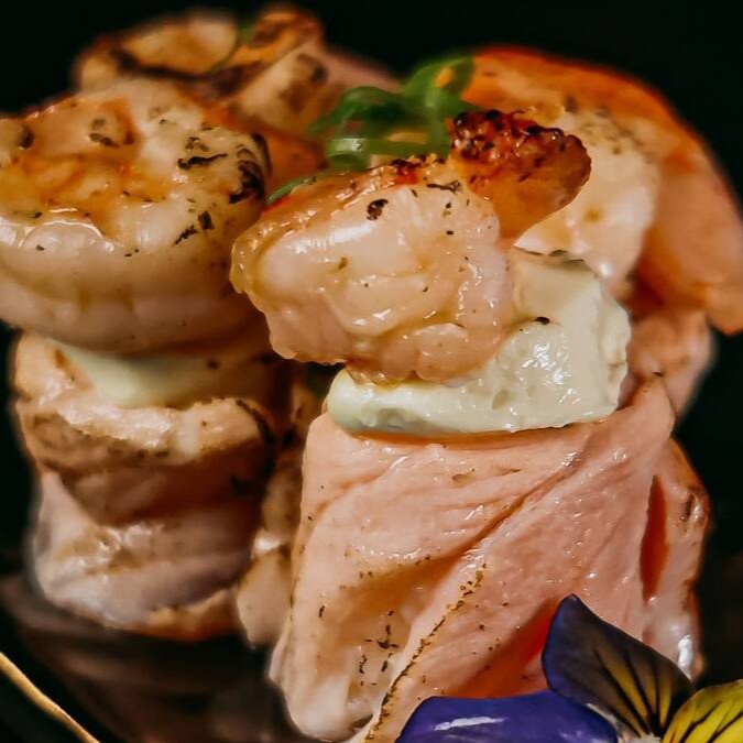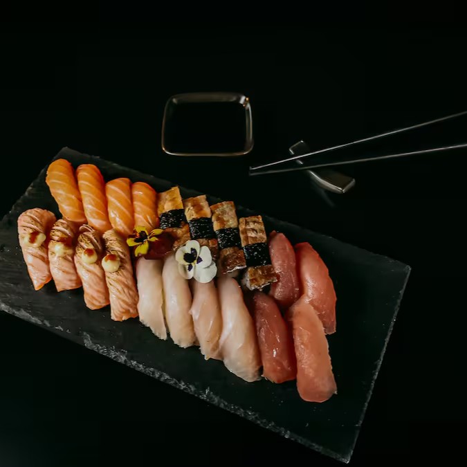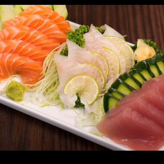 Salmão, atum, camarão e molho de ostra.