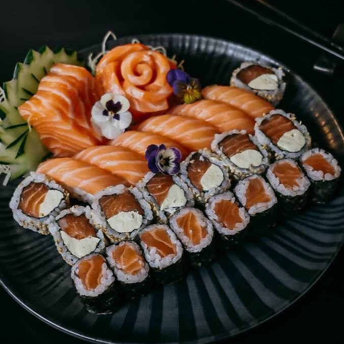 8 sashimi de salmão, 8 uramaki filadelfia, 8 shakemaki e 6 niguiri