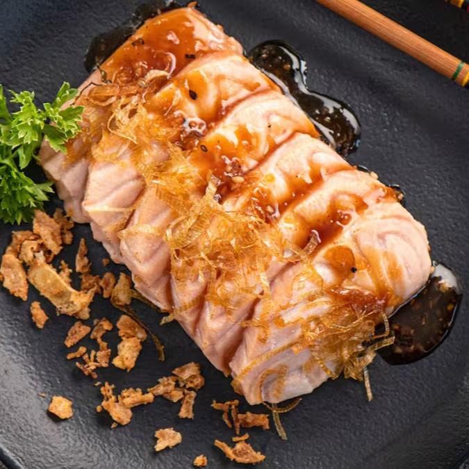 Pele de salmão frita com molho tarê