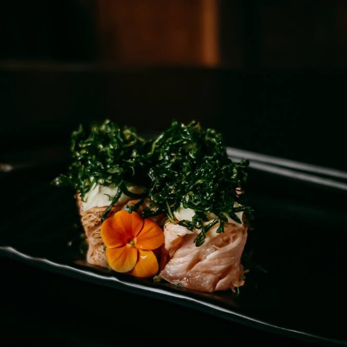 Arroz japonês, pele de salmão suculento, cream cheese, sunomono, manga, edamame, cebola roxa, nori, crisp de batata doce.