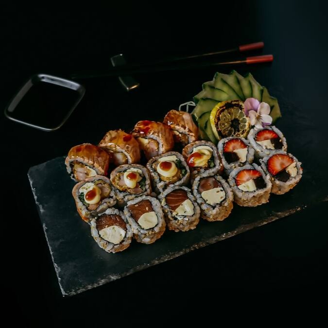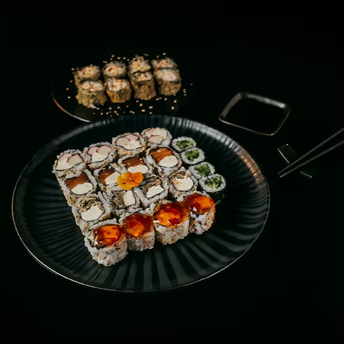 4 uramaki filadelfia, 4 uramaki filadelfia Kani, 4 uramaki skin, 4 uramaki shiro, 4 kapamaki e 8 Hot filadelfia.
