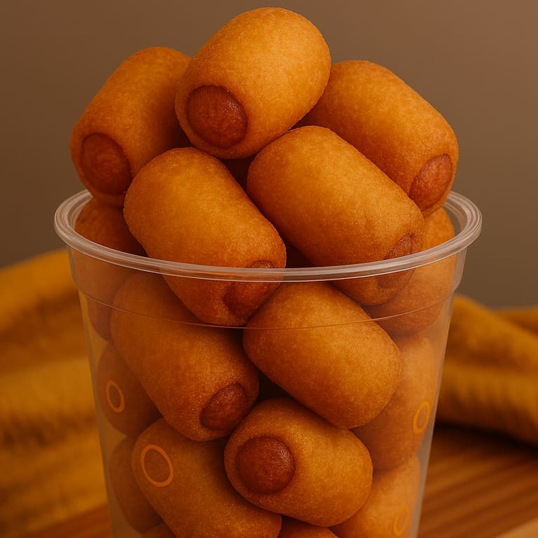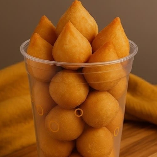 Porção com 20 coxinhas de frango, crocantes e saborosas, servidas no copo. Perfeitas para qualquer momento.