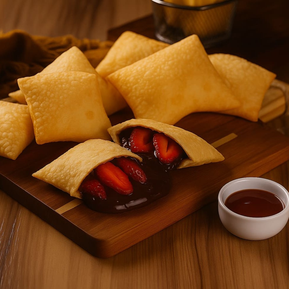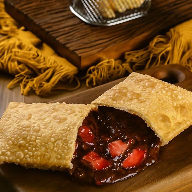 Pastel crocante recheado com creme de avelã cremoso e pedaços de morango fresco. Uma combinação irresistível de sabor e textura — doce, suave e perfeita!