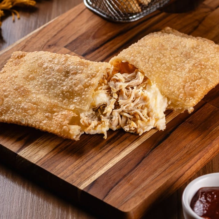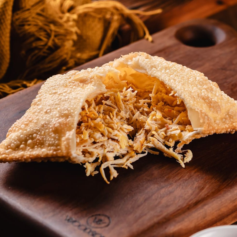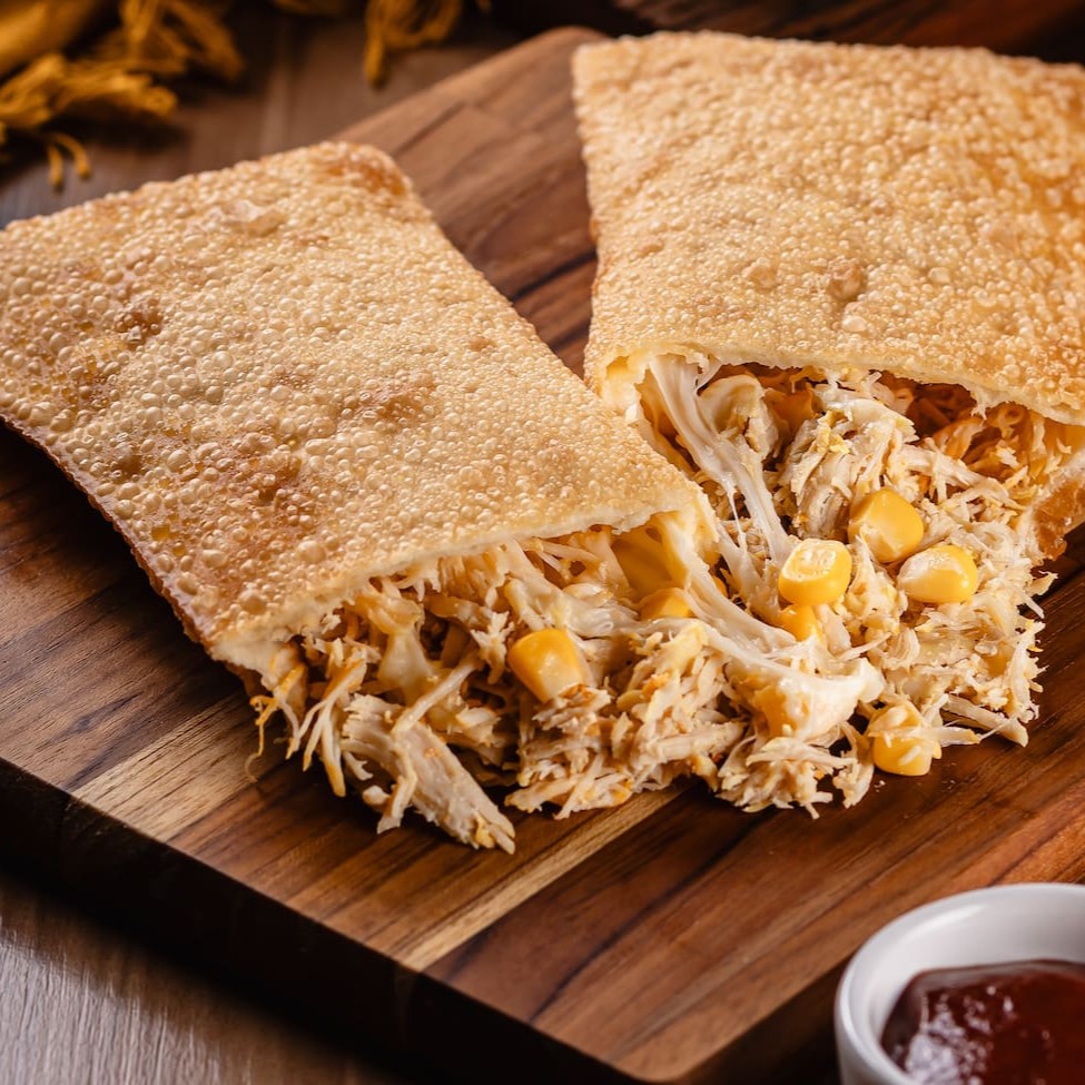 Recheio suculento de frango desfiado com temperos caseiros, envolto em massa crocante.