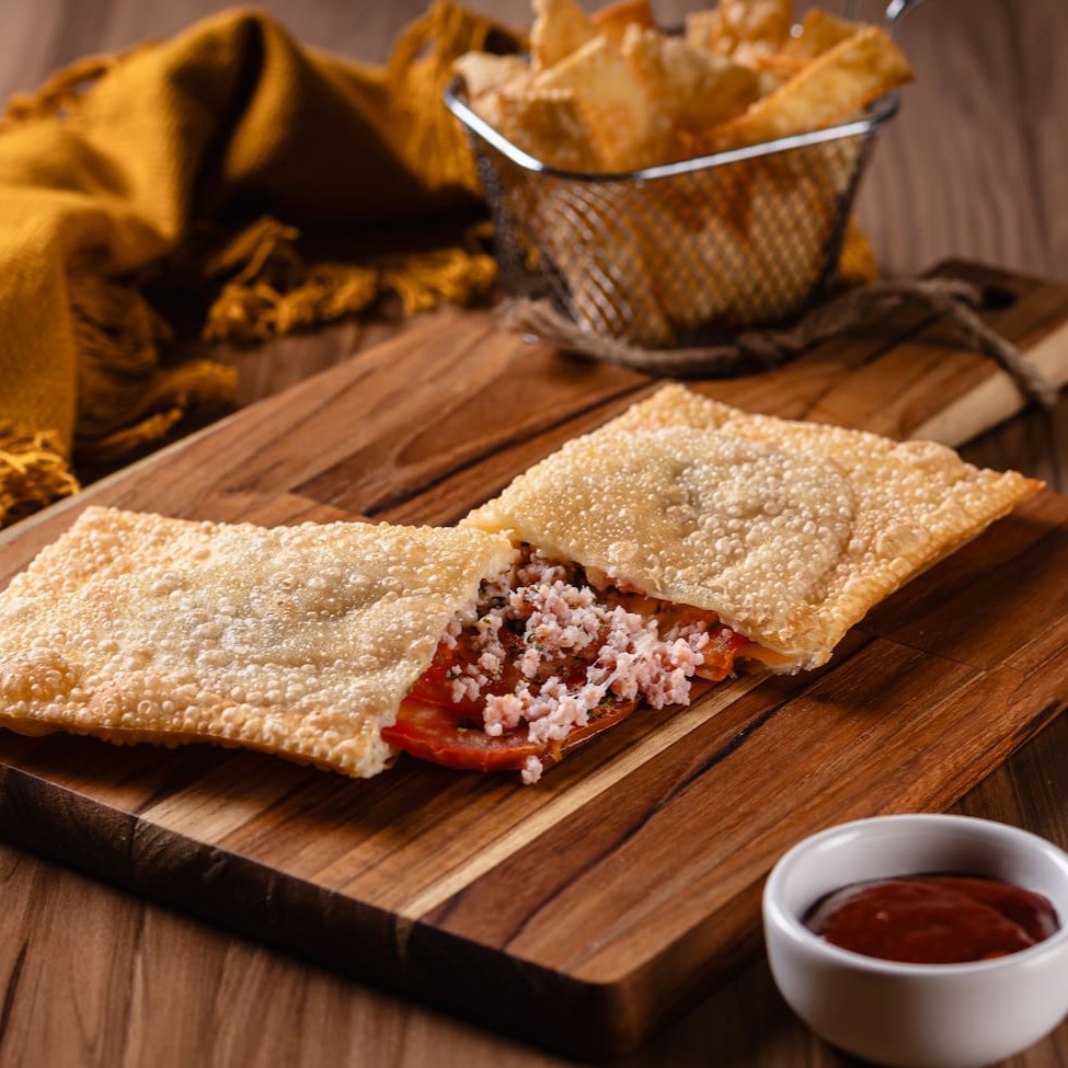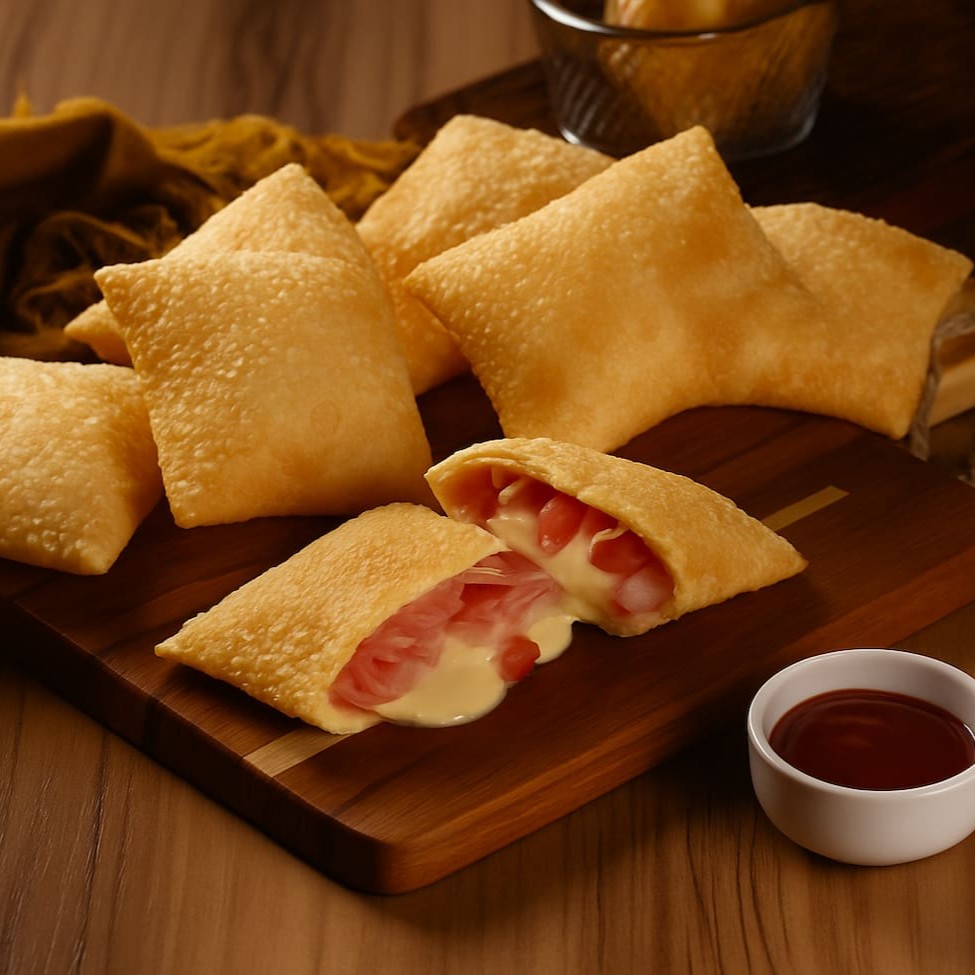 O favorito de todos! Recheado com mussarela, presunto, tomate e orégano — sabor de pizzaria em forma de pastel.