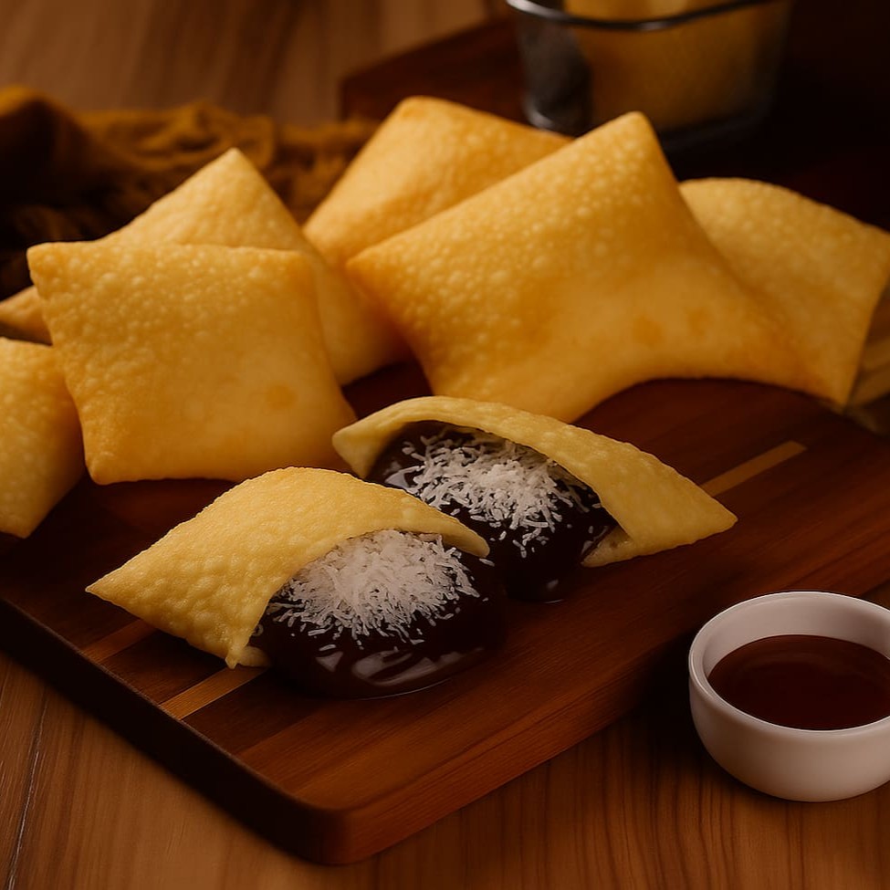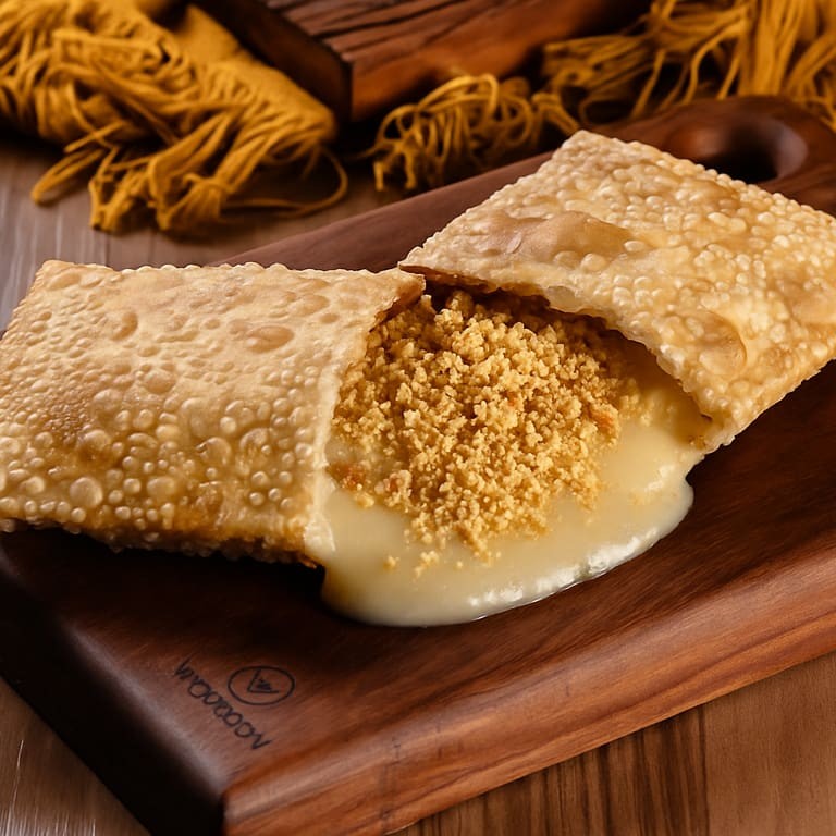Delicioso pastel recheado com coco ralado, mussarela, chocolate branco e leite condensado. Crocante por fora e cremoso por dentro — uma combinação doce e irresistível!
