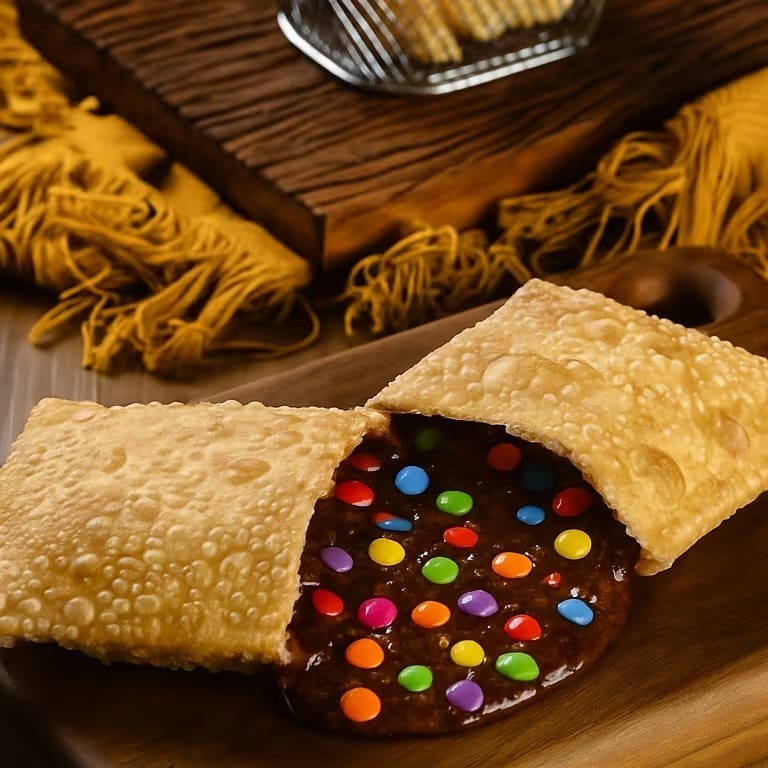 Pastel crocante recheado com chocolate preto cremoso e confetes coloridos. Doce, divertido e irresistível — uma explosão de sabor em cada mordida!