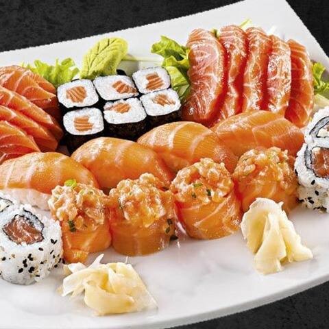 Temaki médio salmão ou filadélfia + hot filadélfia 8 uni + uramaki filadélfia 8 uni.