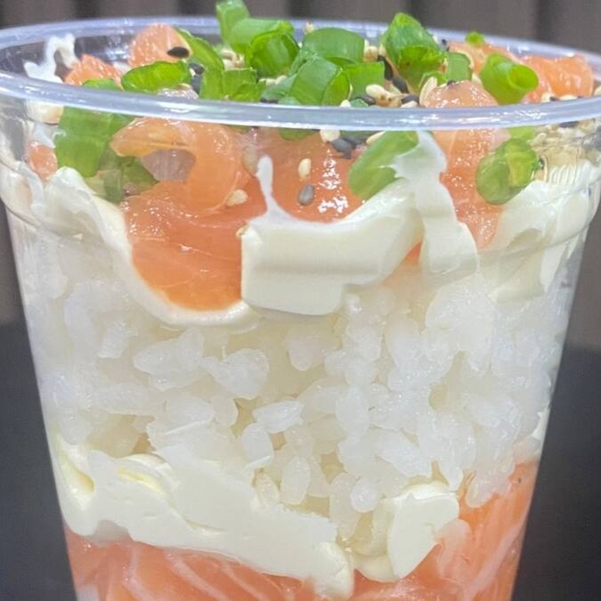 Salmão em cubos, filadelfia, gergelin, pepino, arroz, cebola roxa, manga, kanikama