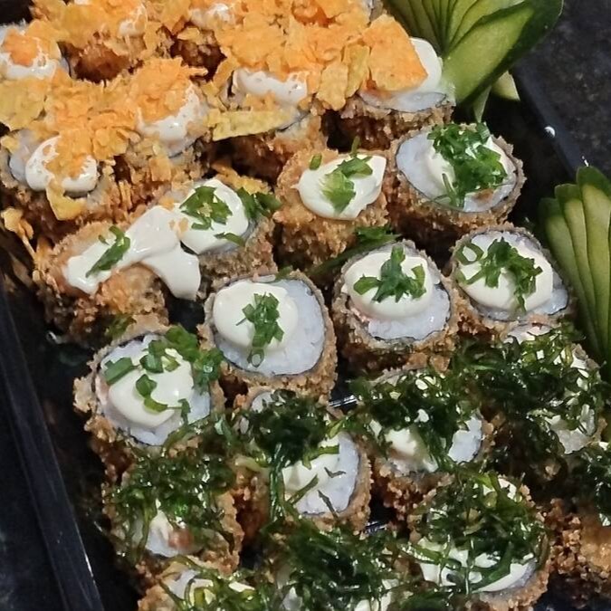 8 Hots Filadélfia finalizados com cream chease e Couve Crispy