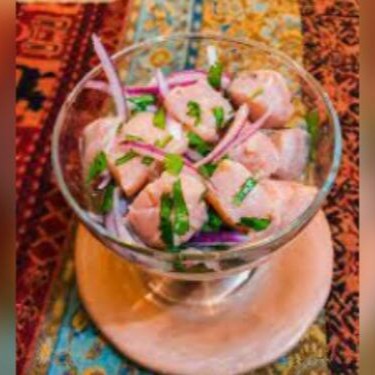 Ceviche peixe branco e salmão, manga, kani, batata doce crips, pepino, arroz