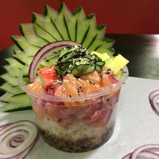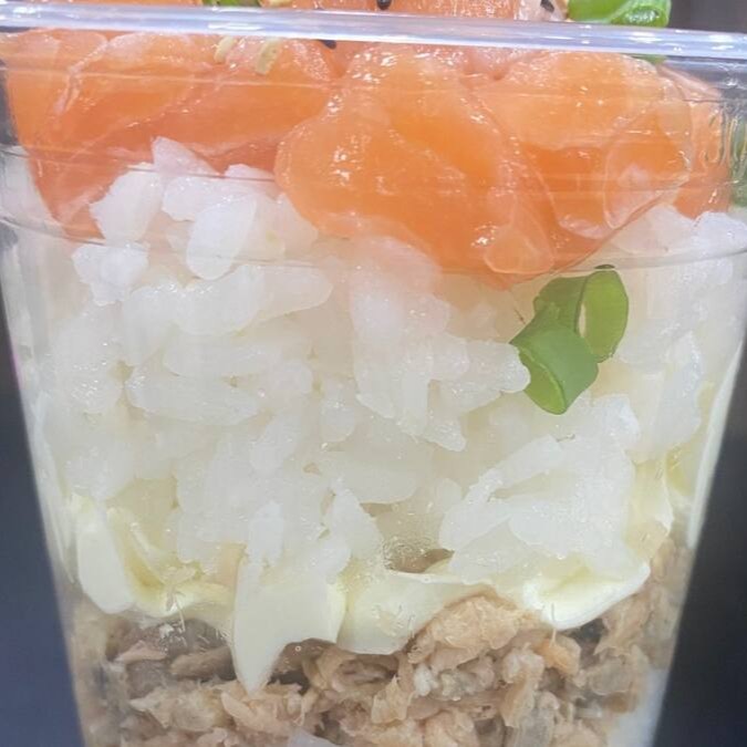 Cubos de salmão, cebola roxa, kani kama, manga, pepino, arroz