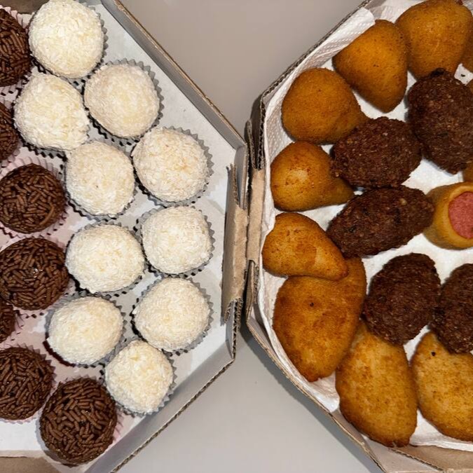 Nosso 'Combo 2' é uma tentadora seleção de 25 salgadinhos fritos variados, perfeitamente crocantes e recheados, proporcionando uma explosão de sabores. Além disso, incluímos 25 doces sortidos, uma irresistível combinação de brigadeiros e beijinhos, preparados artesanalmente, prometendo derreter em sua boca com sua doçura equilibrada. Por favor, note que o docinho de paçoca não está incluído neste combo.