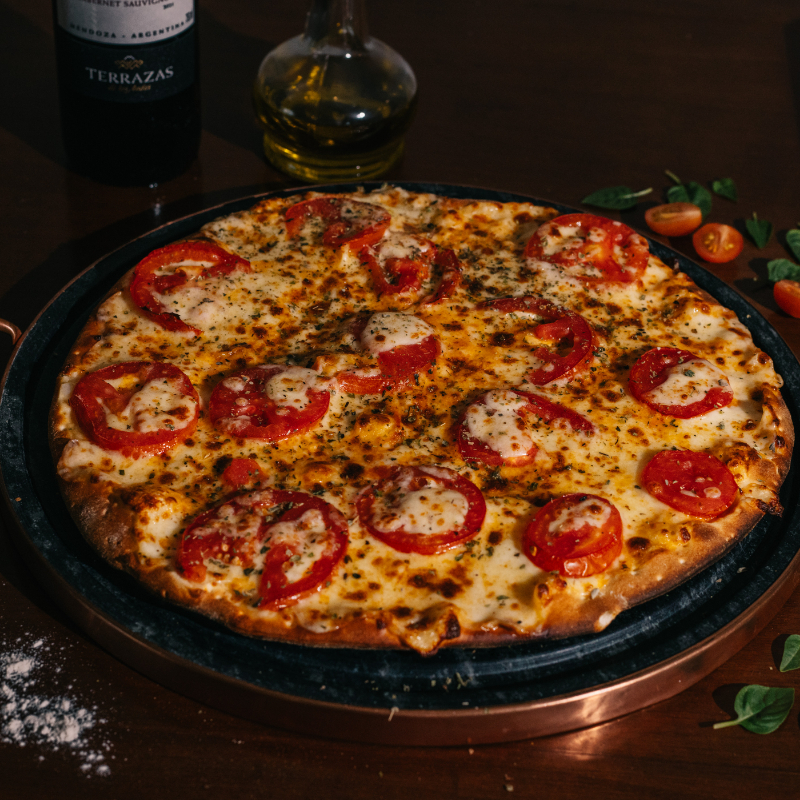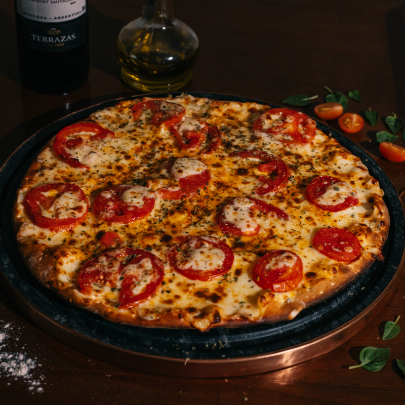 Mussarela, presunto, frango, milho verde, bacon, champignon e orégano