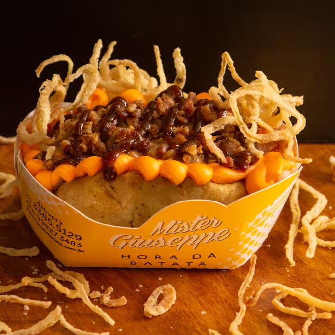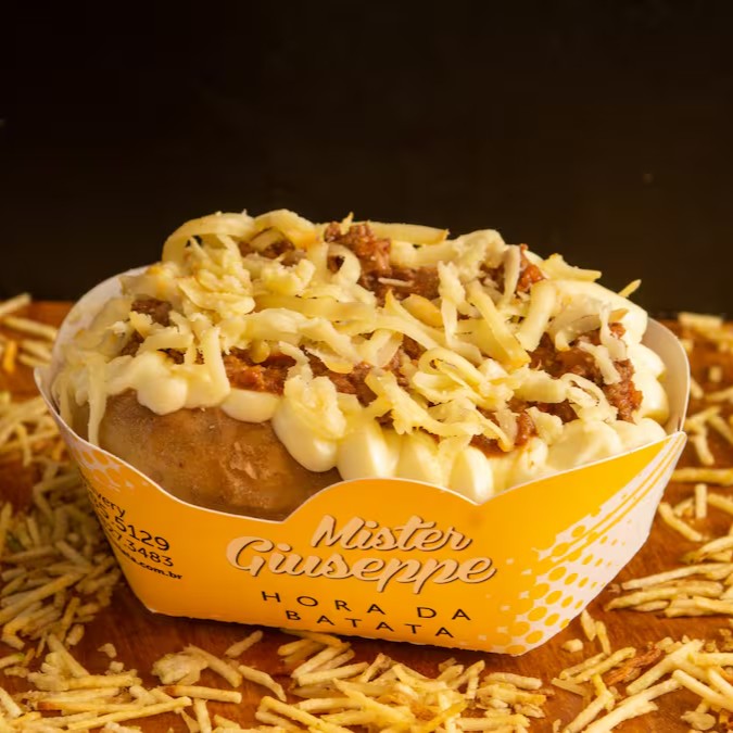 A Batata Recheada de Strogonoff de Carne é um prato irresistível. Nele, um generoso recheio de strogonoff de carne, de sabor robusto e apurado, é habilmente combinado com um suave e cremoso requeijão. A batata palha, crocante e dourada, adiciona textura e um sabor inconfundível. Esta combinação cria uma experiência gastronômica única, rica em sabores e texturas, que encanta o paladar. Ideal para quem aprecia a tradição do strogonoff, com um toque gourmet de sofisticação.