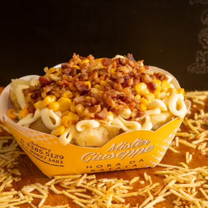 Uma irresistível Batata Recheada de Milho Verde com Bacon, um prato que combina o sabor suave do milho verde com o toque defumado do bacon crocante. Para tornar este prato ainda mais saboroso, adicionamos um generoso recheio de requeijão cremoso que derrete na boca, proporcionando uma experiência gastronômica única. Finalizamos com uma cobertura de batata palha crocante, que adiciona uma textura extra e um sabor inconfundível. Uma opção perfeita para quem busca um prato reconfortante e delicioso.