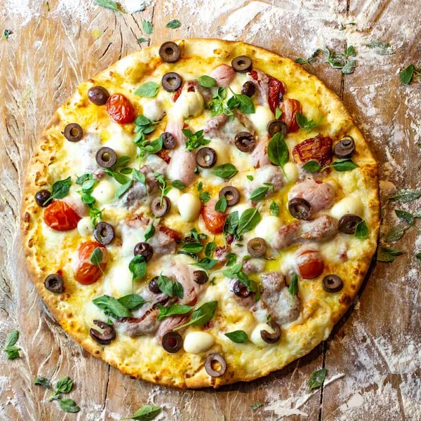 Mussarela, presunto, cebola, frango, milho, palmito, azeitonas, Catupiry e orégano.
