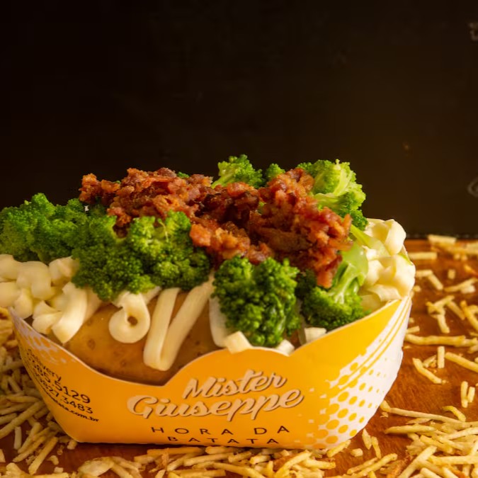 Deliciosa Batata Recheada de Brócolis da categoria 'Batata Recheada'. Este prato é um triunfo de sabores, reunindo o sabor suave e cremoso do requeijão, a crocância da batata palha e o toque defumado do bacon. O brócolis, estrela do prato, é cozido à perfeição, trazendo uma deliciosa mistura de texturas e sabores. Um prato cheio de sabor e personalidade para você se deliciar!