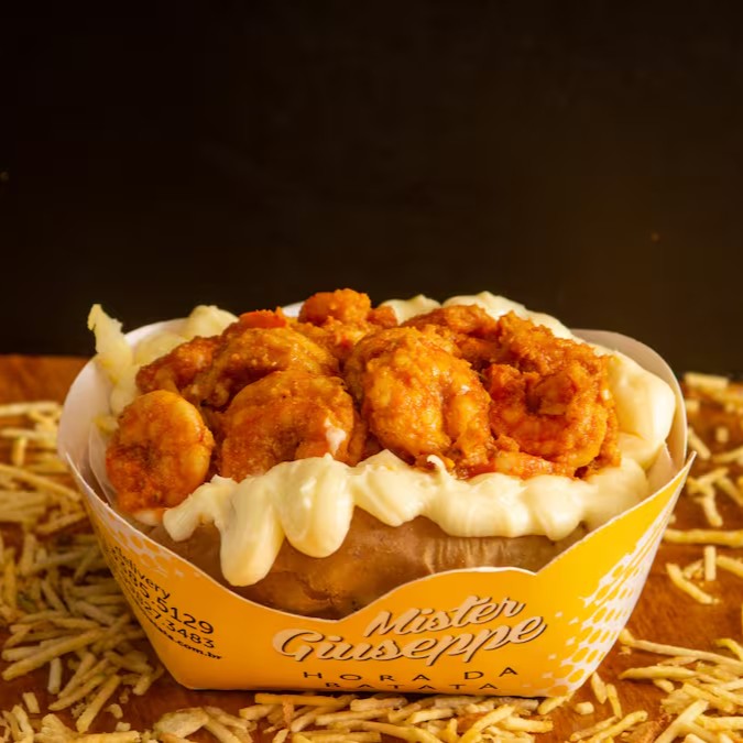 A 'Batata Recheada de Camarão' é uma deliciosa combinação de sabores, que promete encantar o seu paladar. A batata é cuidadosamente assada até atingir a textura perfeita, enquanto o camarão, fresco e suculento, traz o toque marítimo ao prato. A cremosidade inigualável do requeijão acrescenta uma camada extra de sabor, e a crocante batata palha finaliza a composição com um contraste incrível. É uma opção irresistível para os amantes de frutos do mar e batata. Uma verdadeira explosão de sabores em cada mordida!