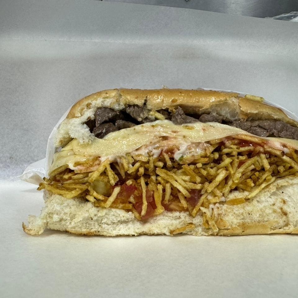 Pão, vina, maionese, tomate, milho, batata palha, tiras de alcatra, queijo mussarela e catchup.