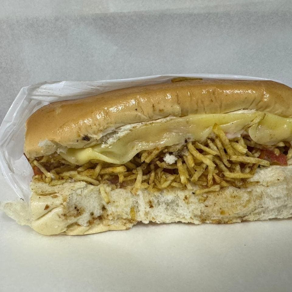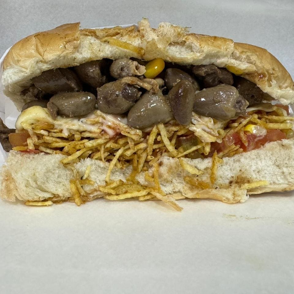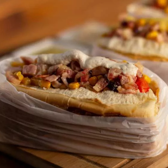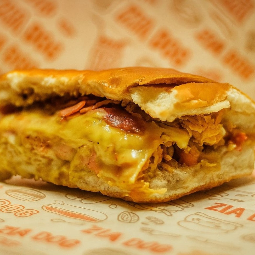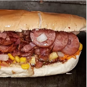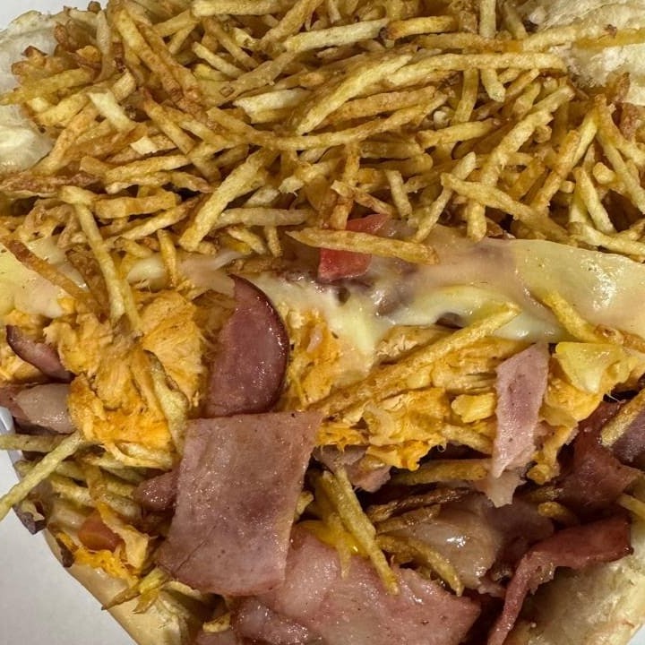 Frango, bacon, calabresa, lombinho, ovo e cheddar pão, vina, maionese, tomate, milho, batata palha, catchup, maionese e queijo mussarela