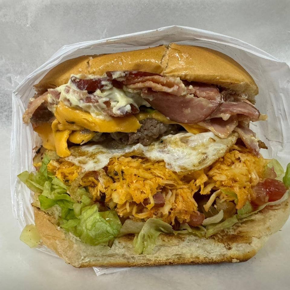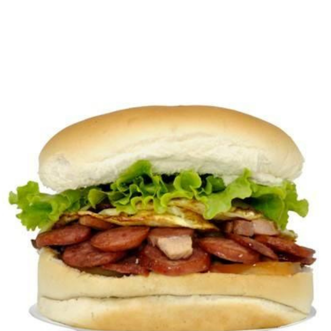 Pão, maionese, alface, tomate, milho, queijo, catchup e hamburguer artesanal e lombinho.