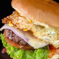 Pão, maionese, alface, tomate, milho, queijo, catchup e hamburguer artesanal e ovo