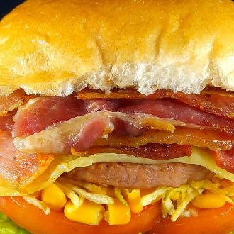 Pão, maionese, alface, tomate, milho, queijo, catchup e hamburguer artesanal e bacon.