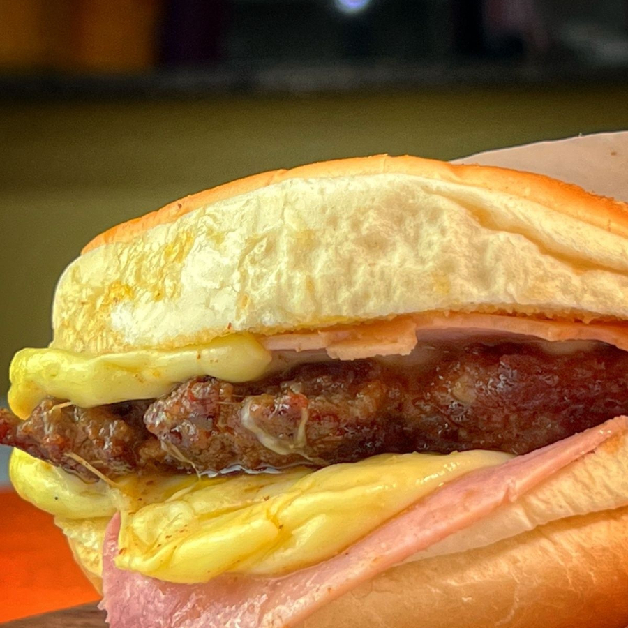 Pão, maionese, queijo, presunto, catchup e hambuguer artesanal.