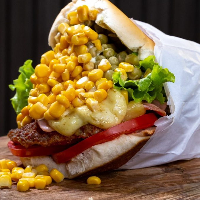 Pão, maionese, alface, tomate, milho, queijo, catchup e hamburguer artesanal e três sabores à sua escolha.