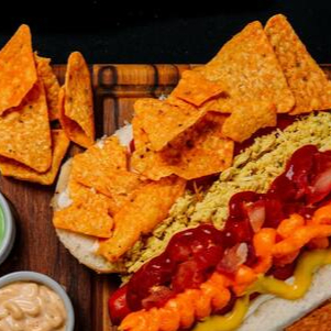 Pão, vina, maionese, tomate, milho, batata palha, carne moída, doritos, barbecue, queijo mussarela e catchup.