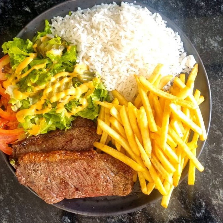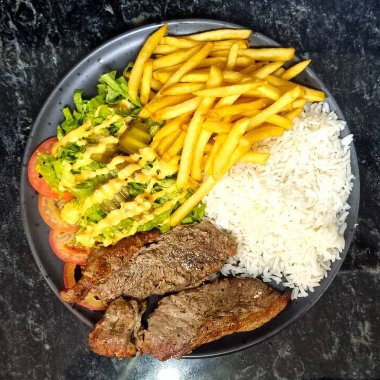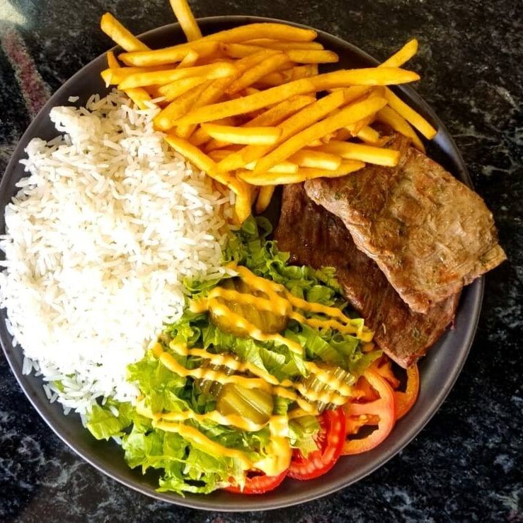 Arroz, Bife 200g temperado, assado no carvão, salada de alface, tomate, picles, finalizada com molho rose e fritas.