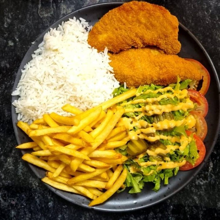 Arroz, peito de frango empanado , salada de alface, tomate, picles, finalizada com molho rose e fritas.