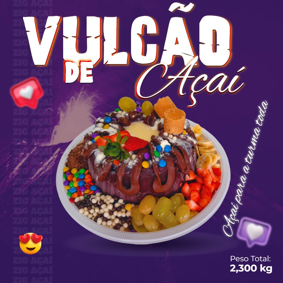 Vulcão de açaí é uma sobremesa feita com açaí, frutas frescas e creme de avelã entre outros acompanhamentos. O vulcão tem 12 acompanhamentos, é ideal para servir até 8 pessoas, pesando aproximadamente 2,300 kg. A base é composta por açaí, enquanto os acompanhamentos podem variar entre frutas frescas, granola, leite condensado, creme de avelã, entre outros, proporcionando uma explosão de sabores e texturas. Acompanha: -1,600 Kg de açaí -Morango -Banana -Abacaxi -Uva -Granola -Poçoca moida -Confete -Chocoball -Ovomaltine (Original) -Leite Pó -Leite Condensado -Creme de avelã